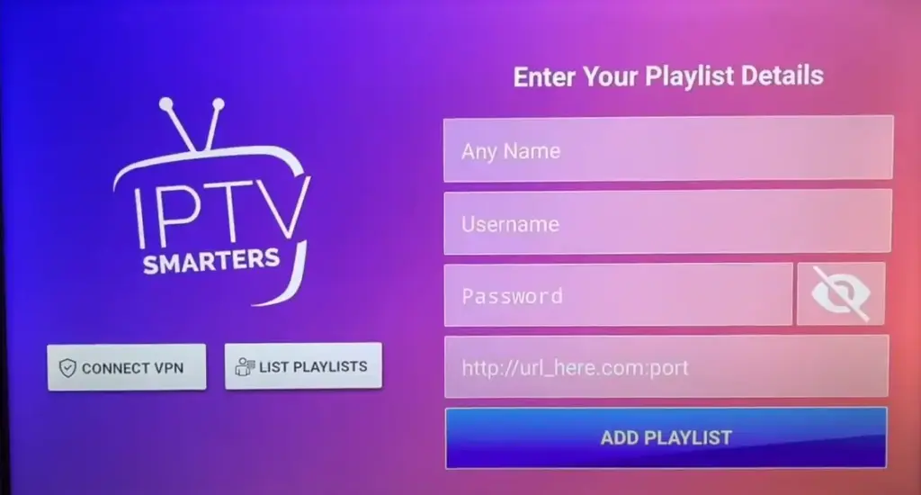 Enter your M3U URL or Xtream Codes API details provided by your IPTV provider.